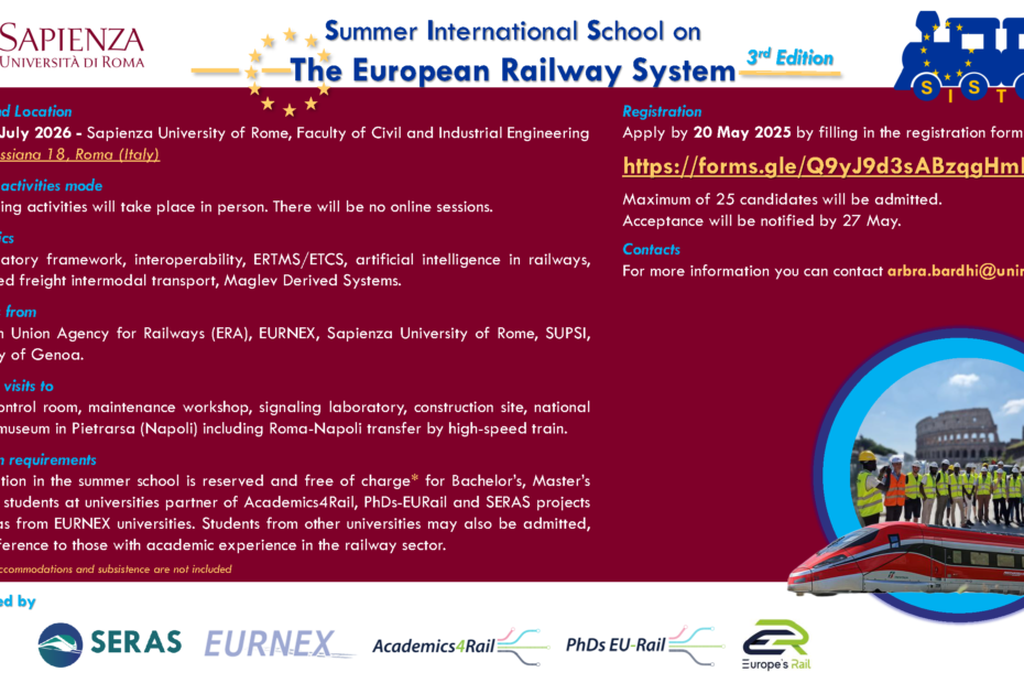 following the first successful editions in 2024 and 2025, in the framework of the EU-Rail funded projects Academics4rail, PhDs EU-Rail and SERAS, we are pleased to announce that the third edition of the Summer International School on The European Railway System (SISTERS 2026) will take place in Rome, from 14/07/2026 to 22/07/2026. The participation… Read More »Summer International School on The European Railway System (SISTERS 2026)